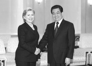 胡锦涛在人民大会堂会见希拉里时说,中美两国都是世界上有重要影响的国家。两国在事关世界和平与发展的重大问题上,具有广泛的共同利益,都肩负着重要责任。21世纪中美关系是世界上最重要的双边关系之一。在当前国际金融危机不断扩散和蔓延、各种全球性挑战日益突出的背景下,进一步深化和发展中美关系比以往任何时候都更为重要。中国政府始终从战略高度和长远角度看待中美关系,愿同美方一道,抓住机遇,共迎挑战,推动中美关系进一步向前发展。