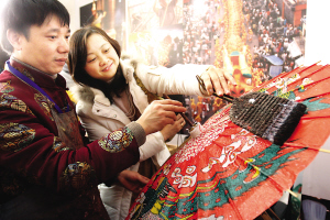 2月22日,在中国非物质文化遗产传统技艺大展上,一名女士向四川油纸伞传统制作工艺第六代传人许学明学习制伞工艺。在北京全国农业展览馆举行的中国非物质文化遗产传统技艺大展吸引了许多观众来到现场学艺,展会成了人们学习民族传统技艺的“第二课堂”。 新华社发