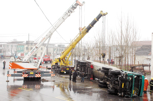 本报讯 昨日上午,市区太清路与中州北路交叉口,一辆20多米长的运输液氨的大罐车为躲避雨中疾驶的小型面包车,造成自身侧翻路旁。所幸的是,罐车是空车,未导致人员伤亡。多个部门闻讯前去救援,很快使该路段恢复交通。