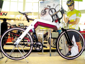 正在台北举行的“2009年台北国际自行车展览会”上,来自台湾的徐鹏越和大陆的邵坤、孙宏雨三人共同合作设计的作品“±×(加减乘)”夺得第十三届全球自行车设计比赛唯一的金奖。该作品可以针对骑乘者的需求变换三种不同的车架形式且操作简单。图为获得金奖的自行车。新华社记者 李凯 摄