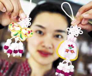 3月19日,四川国际标榜职业学院的学生在“货郎车”前展示桃花系列小工艺品——桃花小香包。四川国际标榜职业学院利用正在举行的成都国际桃花节旅游产品展销会,推出了该校大学生的创业示范项目、一个销售以桃花系列小礼品为题材的“春桃创业货郎车”。据悉,很多旅游景区对这个项目十分感兴趣,并准备与该校合作开发销售,学校也将利用这些销售所得建立大学生专项创业基金,为一些准备创业的大学生提供资金。新华社发