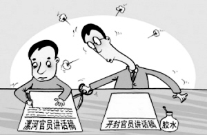 3月13日,“中国消防在线”网站上的开封副市长有关消防工作的讲话稿和漯河政法委书记的讲话稿如出一辙,更为雷人的是,开封市副市长的讲话中竟还有“构建和谐平安漯河”的字眼,被网友戏称为“开封指导漯河工作”。(3月24日《华商报》)
