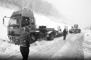 4月21日,在哈(尔滨)牡(丹江)高速公路牡丹江市海林境内,清雪车正在牵引一辆滑到路边的车辆。当天,黑龙江牡丹江海林市境内大雪纷飞,哈(尔滨)牡(丹江)高速公路积雪严重。当地公路管理部门已组织专业清雪车辆清雪,同时安排人力抛撒炉灰等防滑材料,保障交通安全。