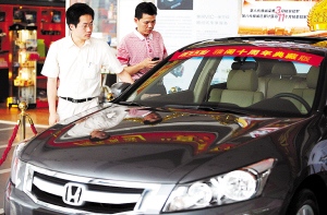广州市国税局日前公布的统计数据显示,广州市汽车销售近期呈现回暖态势。今年一季度,广州市车购税收入为44723.71万元。据分析,3月份1.6升排量以下乘用车征收车辆数比2月份上升了42.51%,征收额上升了39.19%,曾一度低迷的车市在近期逐渐回暖。图为顾客在广州一家本田汽车4S店内被一辆轿车吸引。