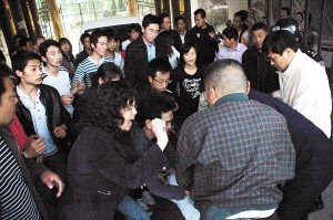跑到校外的那名工商人员立即向所里汇报,10多分钟后,蔬菜工商所和市工商局川汇分局经检大队的10多名执法人员赶到。执法人员强行打开大门,并将一名欲锁门的传销人员带到执法车内询问情况。此时,近百名传销人员围在校门口大喊大叫,和执法人员纠缠。