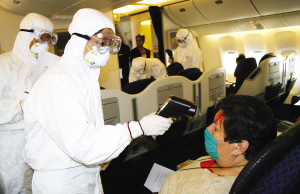 本报综合消息 4月30日清晨,墨西哥航空公司由墨西哥城至上海的AM098航班抵达上海浦东国际机场。检验检疫部门上机对旅客进行体温测量,对托运行李进行消毒。下客之后,对飞机进行消毒。