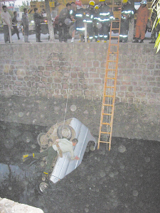 所幸车子没有翻转,而是平平地掉进了渠中,车身有一半没入水中。由于渠水只有约1.5米深,车中的人暂时不会有溺水的危险。但由于水面离岸上有4米多高,车子摔下去车中人很可能受伤。