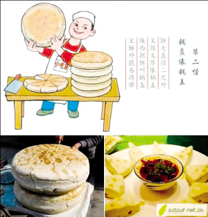 这种烙面饼后发展成为风味方便食品。锅盔整体呈圆形,直径尺许,厚1寸,重5斤。料取麦面精粉,慢火烘烤,外表斑黄,切口砂白,酥软适口,能久放,便携带。 (燕西)