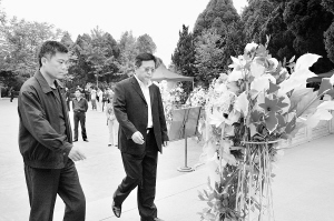 周口日报社社长杨箴红(右)、总编辑叶楠代表报社为焦裕禄烈士赠送花篮。(沈湛 摄)