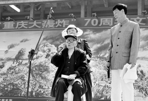 5月3日,70年前“大轰炸”的幸存者——年逾90岁的沈宗香老人正在控诉日本侵略者的暴行。当日,众多重庆民众和部分“重庆大轰炸”幸存者以及来自日本的友好人士在重庆九龙坡区巴国城广场举行纪念“重庆大轰炸”70周年文艺演唱活动。1938年2月至1943年8月,侵华日军对重庆进行了200余次轰炸,造成惨重的人员伤亡和财产损失,史称“重庆大轰炸”。其中,1939年5月3日和4日的轰炸最为惨烈,造成数千人死伤,约20万人无家可归。 新华社发