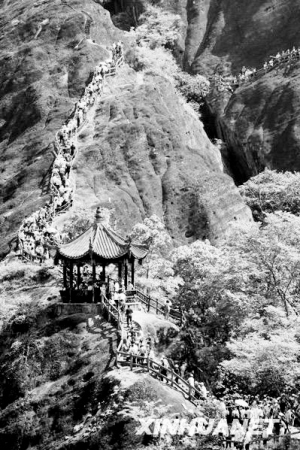 当日是“五一”小长假第一天, 武夷山天游峰上游人如织,但没有出现“井喷”现象,武夷山景区旅游秩序井然有序。新华社发