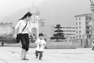 5月9日,在四川德阳市汉旺镇东汽集团厂区,谭千秋的妻子张关容和女儿仙子朝东汽中学的旧址走去。3个月后,东汽中学将搬到新校舍,张关容和女儿也将住进新家。一年前地震发生时,东汽中学教师谭千秋在教室坍塌的一瞬间,奋力将4个学生拥到课桌下,学生得救了,而谭老师却永远地离开了。小图:在德阳市的龙井公墓,张关容仔细地擦去丈夫墓碑上的灰尘。