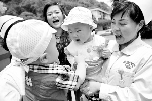 ▲5月11日,两名“地震宝宝”在聚会上“老友”重逢,分外亲切。当日,在去年地震中被都江堰市人民医院的3名护士转移出医院大楼的5名新生儿在亲人的陪同下重聚都江堰市人民医院,看望解救过他们的护士阿姨,同贺周岁生日。