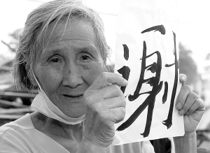 刘慧珍老人带记者参观小儿子家时,两个儿子搀扶着自己的母亲。去年5月16日,在遵道镇高安村,记者拍下了手捧“谢”字的老大娘的照片(小图),在过去一年里被电视、报纸、杂志等各类媒体反复使用。照片中的老大娘刘慧珍80岁。老人今年3月3日就已经搬到了土门镇团结村,和两个儿子住在一起。