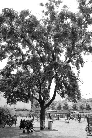 皂角树生长在作坊小学西北角的一块四方空地上,南面紧贴一幢4层教学楼,北面一墙之隔便是学校的西家属院。四周的钢筋水泥、砖舍瓦砾难掩夹缝中依旧盎然的古树绿意。一人难以环抱的古树树冠高出教学楼。这块由古树所营造出的静谧空间,与操场上下课后孩子们奔跑嬉戏所营造的热闹气氛形成强烈对比。