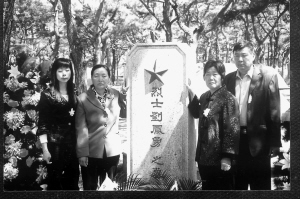 何书记、刘科长和伏记者在“烈士刘凤勇之墓”碑前帮助摆上祭品——花篮、苹果、蛋糕、猪肉、馒头、白酒,并默哀3分钟。刘冠英哭着,和丈夫、女儿、堂妹一起,向父亲磕了3个头,并斟3杯酒洒在坟墓前。