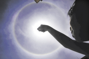 13时30分左右,“光圈”渐渐模糊,历时两个多小时的日晕奇观消失。据了解,此次日晕现象在我市其他一些地方也同时出现。