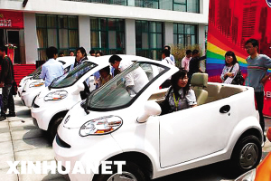 5月18日,在电动车交付仪式上,参观者试乘新型3座位电动车(下图)。当日,常州麦科卡电动车辆科技有限公司举行首批电动车交付仪式。麦科卡电动车用普通220伏电压即可充电,车速最快每小时50公里,一次充电续航可达100公里,仅需电费5元,同样的路程还不到汽油燃料费用的十分之一。该公司还可根据不同客户的要求,制造1至4座位的封闭车型和敞篷车型。(新华)