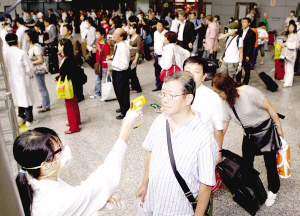 5月19日,来自广东药学院的一位志愿者在广州天河口岸为入境旅客测量体温。目前,我国政府加强了入境口岸的甲型H1N1流感疫情排查工作,由于入境旅客人数众多,工作量极大,一些医药专业的学生积极报名担任志愿者,奋战在防控流感的第一线。 新华社记者 陈建力 摄