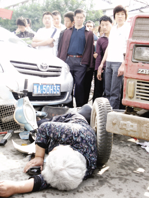昨天上午8时20分许,记者在现场看到,一辆牌照为“豫A50H35”的银白色轿车“骑”在一辆浅蓝色电动车上,一辆四轮农用车停在路中央。电动车旁一名60岁左右、头发花白的老太太躺在地上(如图)。值勤交警正忙着疏散围观的市民。