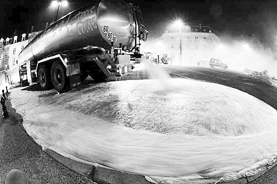 5月19日,在法国勒芒,一些工人在街头举行示威活动,抗议奶制品价格下跌。图为一些参加示威活动的工人把牛奶倒在大街上,表示抗议。 马利 摄