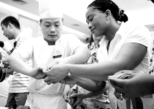 5月23日,在南京工作、学习的130多名外国友人欢聚在南京一家饭店,参加包粽子比赛,与南京市民一同体验端午节传统文化。 新华社发
