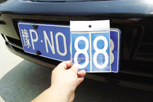 在女老板的推荐下,记者花5元钱买了一套数字“8”的车牌贴(如图)。这套数字“8”的车牌贴有两张,上面分别印有一个数字“8”,底色为蓝色,数字的颜色为白色,可以揭下来贴到车牌上遮盖住原来的数字,无论颜色还是规格都足可以假乱真。
