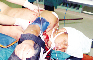 6月19日上午,120急救中心获悉,市区某工地有一名50多岁的男子张某被固定在地上的一根螺纹钢筋贯穿右肩。市中心医院医生火速赶到现场,指挥几名工人钳断钢筋,将张某送到医院组织相关专家参与抢救。由于张某后肩外露钢筋长约50厘米,腋窝前露钢筋长约110厘米,医生无法进行麻醉和手术,院方立即拨打电话求助市消防支队。火速前来支援的消防官兵用专用工具钳断张某贯穿肩部的钢筋,医生才得以麻醉施术。经过近两个小时的手术,胸心外科医生成功拔出钢筋,修补破损的腋窝动静脉血管及破损组织,张某得到有效救治。