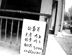 本报综合消息 28日上午10时,沈阳市于洪区格林梦夏一期14号楼西侧临近园区通道,一个约50厘米,宽约30厘米的木板上贴着一张写着“公务员……大专以上……35岁以下……30万元马到成功……130××××××××”的白纸,沿着绿地边上的甬道,另外一张写着同样内容的A4纸,贴在墙上,沿着这两张“价格表”的指引,一个联心便利店的招牌立在了墙面上。
