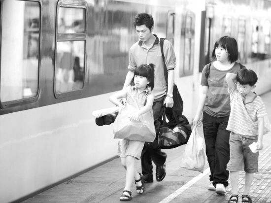 7月1日,几位旅客在广州火车站站台准备上车。当日,2009全国铁路暑运开始,将持续到8月31日,共计62天。铁路部门预计,暑运期间全国铁路将发送旅客3.06亿人次。同时,全国铁路实行新的列车运行图,增开客车9对,其中动车组列车5对,直达特快列车1对,普通快车3对。 新华 摄