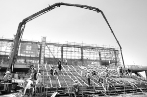 市体育馆主体框架全部施工完毕,球型网架结构在徐州已经加工好,目前负责安装人员已进场,正在现场为网架结构施工做准备,预计明年“五一”能够建成交付使用。来到市体育馆,记者看到这里一派繁忙,市体育馆的布局已经显现,偌大的体育馆被分为三部分,其中有比赛场、训练场和舞台。可容纳5000人的看台分布在比赛场东、西、南三面,北面是一个宽17米、长40米的大舞台,最北面是训练场。