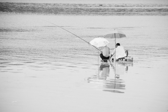 两名钓鱼爱好者端坐在沙颍河里,静静地等待鱼儿上钩。夏日炎炎,水中垂钓的这一幕让人感觉很是惬意。 阿龙 摄