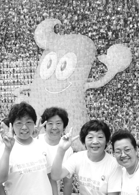 7月5日,在“邻里互助一家亲,文明和谐迎世博”活动现场,静安区的社区志愿者们在吉祥物海宝宣传板前合影。当日是中国2010年上海世博会倒计时300天,上海市民以多种方式宣传世博、迎接世博,为世博会的开幕做好准备。 新华社记者 刘颖摄