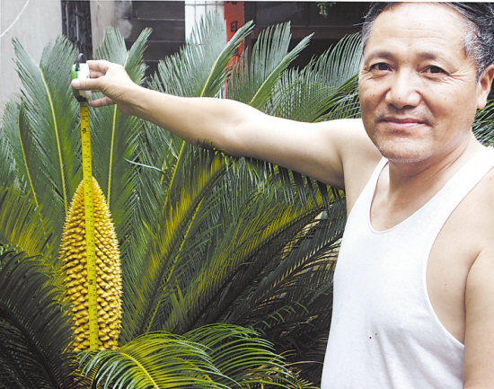 13年前,扶沟县城隍庙街的李世远花两千多元钱买回两棵铁树。20多天前,李世远发现其中1棵铁树长出了“花苞”。昨天中午,李世远边用钢卷尺测量边说:“你看,‘花苞’都半米高了,还在长!” 晚报记者 金月全 摄