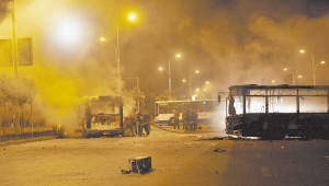 7月6日凌晨,在乌鲁木齐市大湾南路的跑马场地段,多辆公交车被烧毁,消防官兵赶到现场救援。