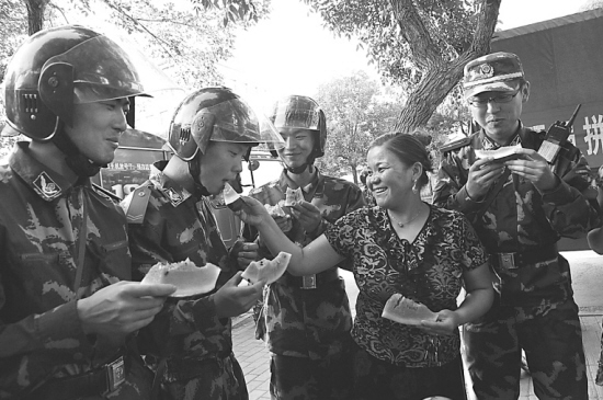 新疆伊宁市的哈萨克族居民古丽娅(右二)和朋友买来西瓜,慰问正在执勤的武警战士(7月8日摄)。乌鲁木齐“7·5”事件发生后,维稳官兵用实际行动保护各族群众的生命和财产安全。他们受到当地群众的欢迎,各界人士以多种方式感谢和慰问维稳官兵。 新华社记者 何俊昌 摄