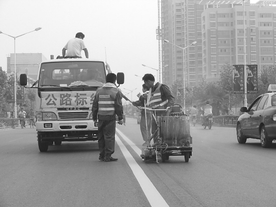 为解决中心城区及沙河北岸部分道路无交通标线、车辆行人混行无序的现状,市交警支队在加大交通管理力度的同时,重新施画建设路全段、大庆南路、中州北路、黄河路、汉阳路及交通路部分路段的热熔交通标线。图为施工现场。 晚报记者 陈永团 摄