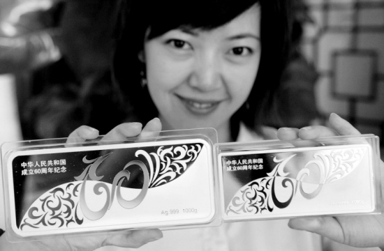 7月14日,工作人员展示新中国成立60周年纪念金银条凤舞系列。由中国印钞造币总公司制造发行、中钞国鼎公司总经销的中华人民共和国成立60周年纪念金银条,将于7月23日在北京菜百商场首发。该套产品分为龙腾系列和凤舞系列。 新华社发
