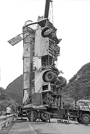右图:7月20日,救援人员用吊车将事故车辆吊上公路。新华社发