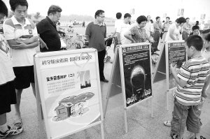 “当月球恰好运动到太阳和地球之间时,月球遮住了太阳射向地球的光,就会发生日食……”市民买先生将科普展板介绍的日食发生过程一字一句地念给自己5岁的女儿听。当天上午,市科协特意准备的30余块科普展板在中州路大桥桥头展出,以图文并茂的形式详细介绍了日食、月食发生时的现象以及发生的原因、过程。买先生说,他很想让女儿亲身观察,以便更形象地了解日偏食现象。虽说天气原因使他的愿望落空,不过,通过这些科普展板,可以让女儿初步了解日食和月食现象。“当然,没有亲眼观看日偏食形象”。