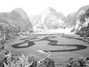 在贵州安顺一景区内,由普通水稻和黑糯米水稻套种了一个植物“龙”字,其造型拓自唐代著名书法家怀素的草书。现字体为紫红色,背景为绿色。到成熟时节,其背景将变为金黄色。该字总占地面积120亩。新华社发