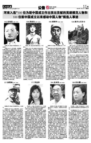 河南入选“100位为新中国成立作出突出贡献的英雄模范人物和