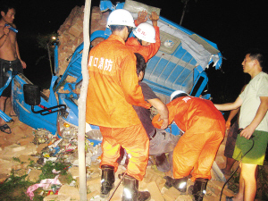 在现场群众的配合下,消防官兵首先清理掉驾驶室四周的砖块,之后利用撬杠慢慢撬起车顶,创造切割面以便切割。2时40分,车顶被切割开,众人一起用力掀掉车顶,一名司机露了出来。“水……”司机呻吟着要水喝。消防战士董爱平立即向救护人员要来一瓶葡萄糖,插入吸管送到司机口中。