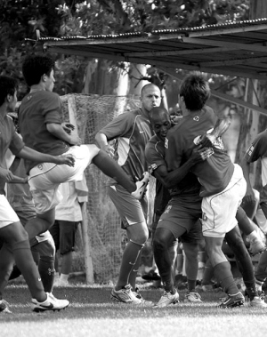 本报综合消息 22日下午,正在昆明海埂备战的重庆力帆与安徽九方进行了一场热身赛,结果双方在场上大打出手,九方队的队员还辱骂力帆队外援金尼。
