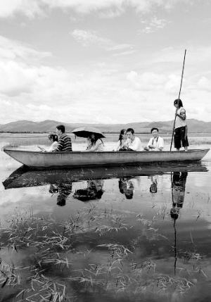 ▲游客坐船游览丽江拉市海湿地公园(7月29日摄)