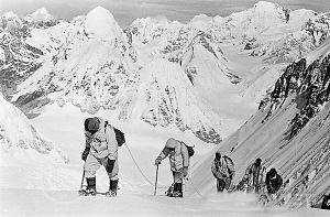 1960年5月24日,王富洲任突击队长,与贡布、屈银华三人于上午9时30分,从8500米的突击营地出发,向珠峰顶峰发起突击。当时,每个人背了许多东西:两个4.7公斤的氧气瓶、睡袋和摄像机,吃的大部分是压缩食品,两瓶氧气只能用8个小时。冻伤是登山者最大的敌人,在登顶过程中,王富洲左脚脚趾全部冻掉了,屈银华的右手食指和两脚脚趾也被冻掉了,脚跟后面冻掉了一块肉。