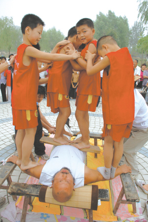 图中的老人叫高金诚,今年57岁。昨天早上,在周口市区沙颍河公园,老人表演了他的绝活。只见他把头、手、脚分别放在几把椅子上,身体悬空部位竟能承受住6位体重均为三四十公斤的孩子的踩踏。