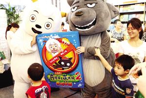 8月13日,小朋友们在展厅里争相与《喜羊羊与灰太狼》的卡通形象合影。