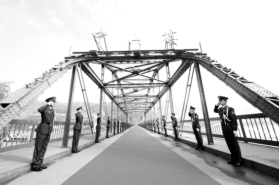 8月26日,武警官兵在兰州黄河铁桥百年庆典大会上敬礼。当日,被誉为“天下黄河第一桥”的兰州黄河铁桥迎来百岁生日,人们为这座古桥隆重举行百年庆典仪式。1909年8月建成通车的兰州黄河铁桥,又称“中山桥”,是黄河上第一座永久性公路桥,也是目前甘肃省会兰州的标志性建筑之一,2006年被列为全国重点文物保护单位。新华社发