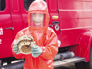 当日,太康县消防大队接到群众报警,称自家卧室内有一个马蜂窝。接到报警,6名消防官兵迅速赶到现场,打开卧室吊顶,发现一个长约30厘米、直径约10厘米的圆柱型马蜂窝悬挂在屋顶上,马蜂窝四周爬满了马蜂。见此,消防官兵立即关上卧室窗户,穿上防蜂服,拿来一瓶杀虫剂,对着该蜂窝一阵猛喷。并找来一个木棍捣掉蜂窝,用事先准备好的大塑料袋装了起来。